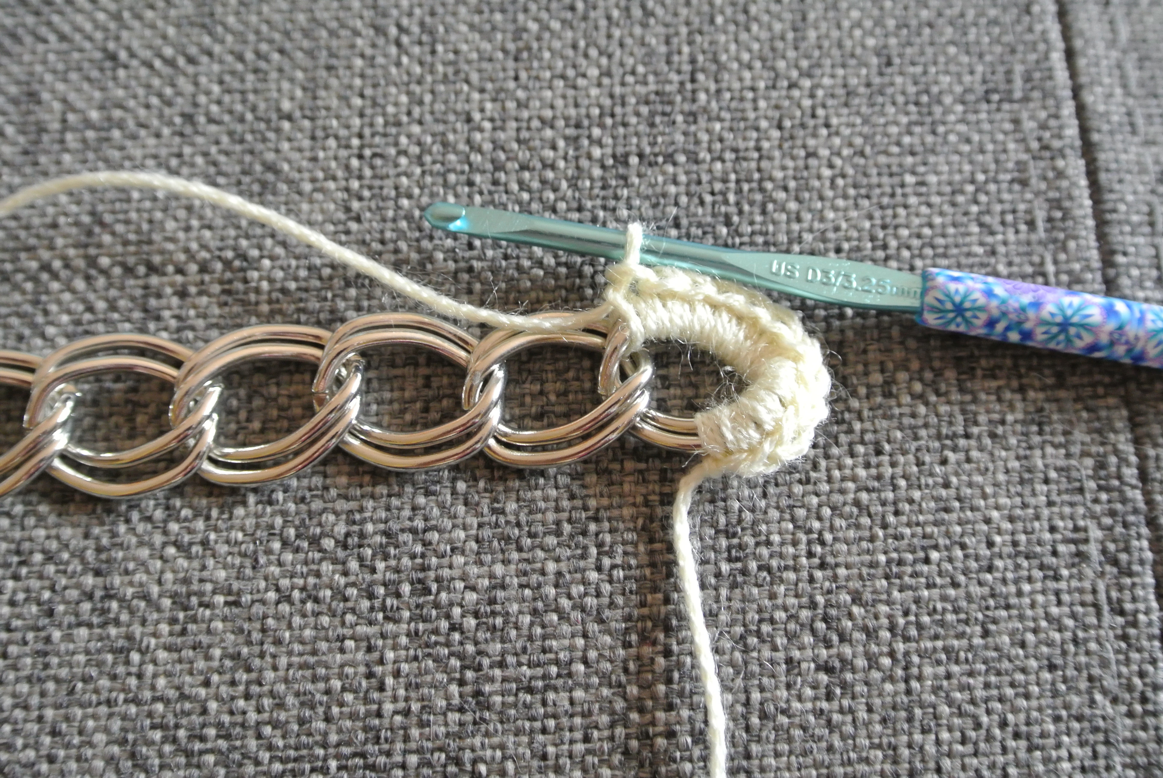 I got my chain at Walmart but some bead stores have spools of it and you can buy as much or as little as you’d like. I used a curb chain for this project, if you look in the first photo, you’ll see that the links are shaped in such a way that the chain lays flat and it makes it easy to crochet around the outside edge.