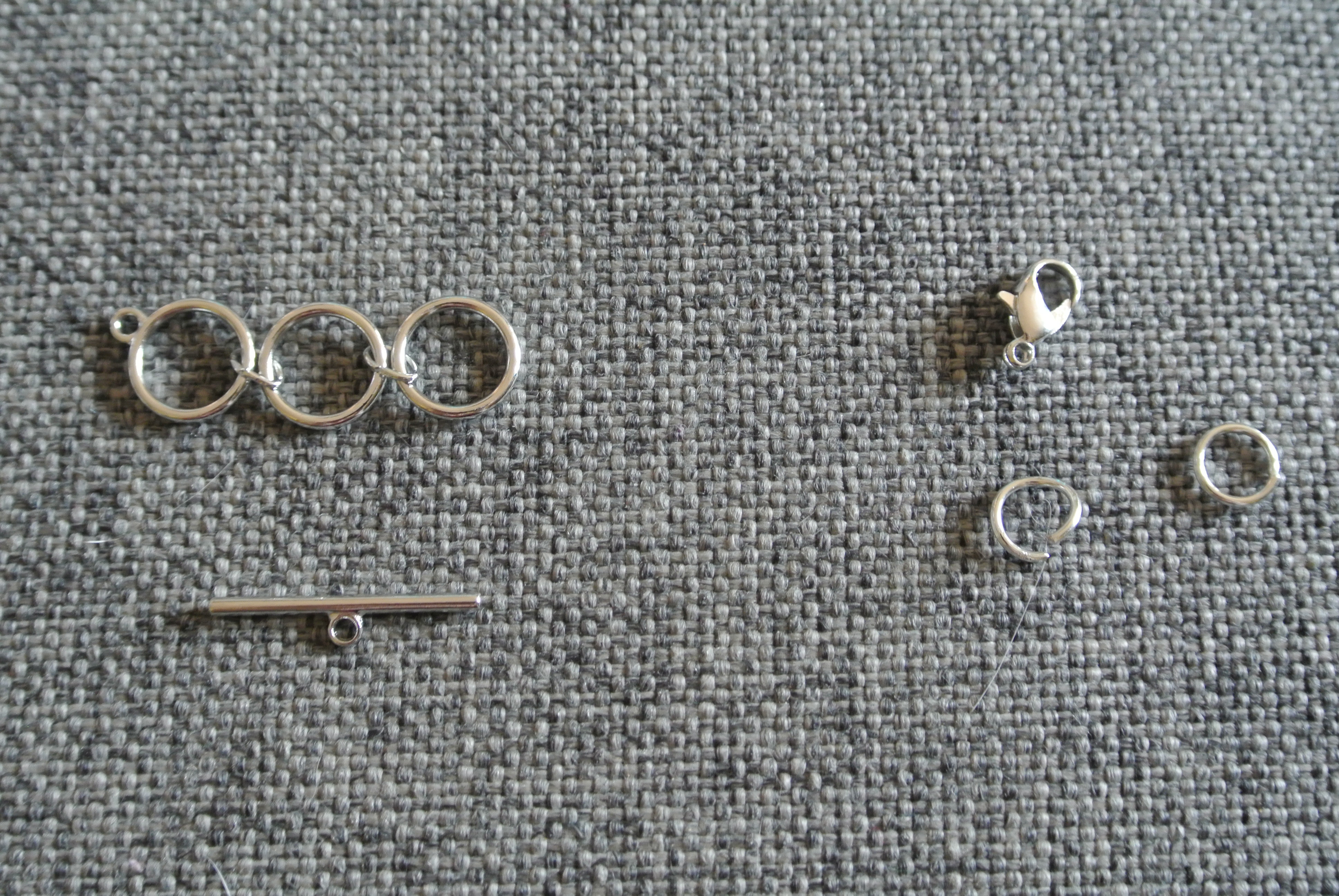 You’ll also need a clasp of some sort. Personally, I prefer toggles (left), they’re easier to use, especially if you’re making a bracelet. I also used the jump rings pictured as well as one more that isn’t pictured. Also not pictured: yarn needle and scissors.