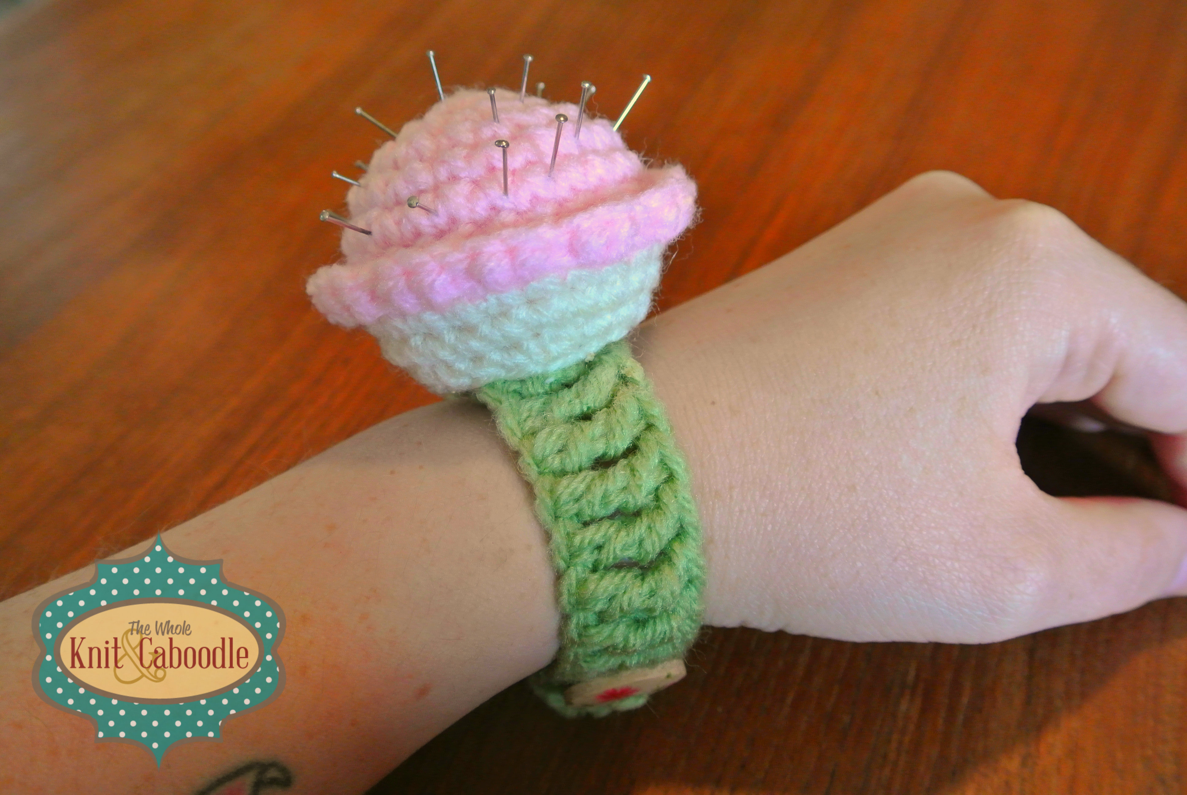 While I don’t see the cupcake bracelet catching on as a fashion accessory anytime soon, it’s perfect for keeping pins close at hand at wrist when you’re sewing or assembling a knitting/crochet project.